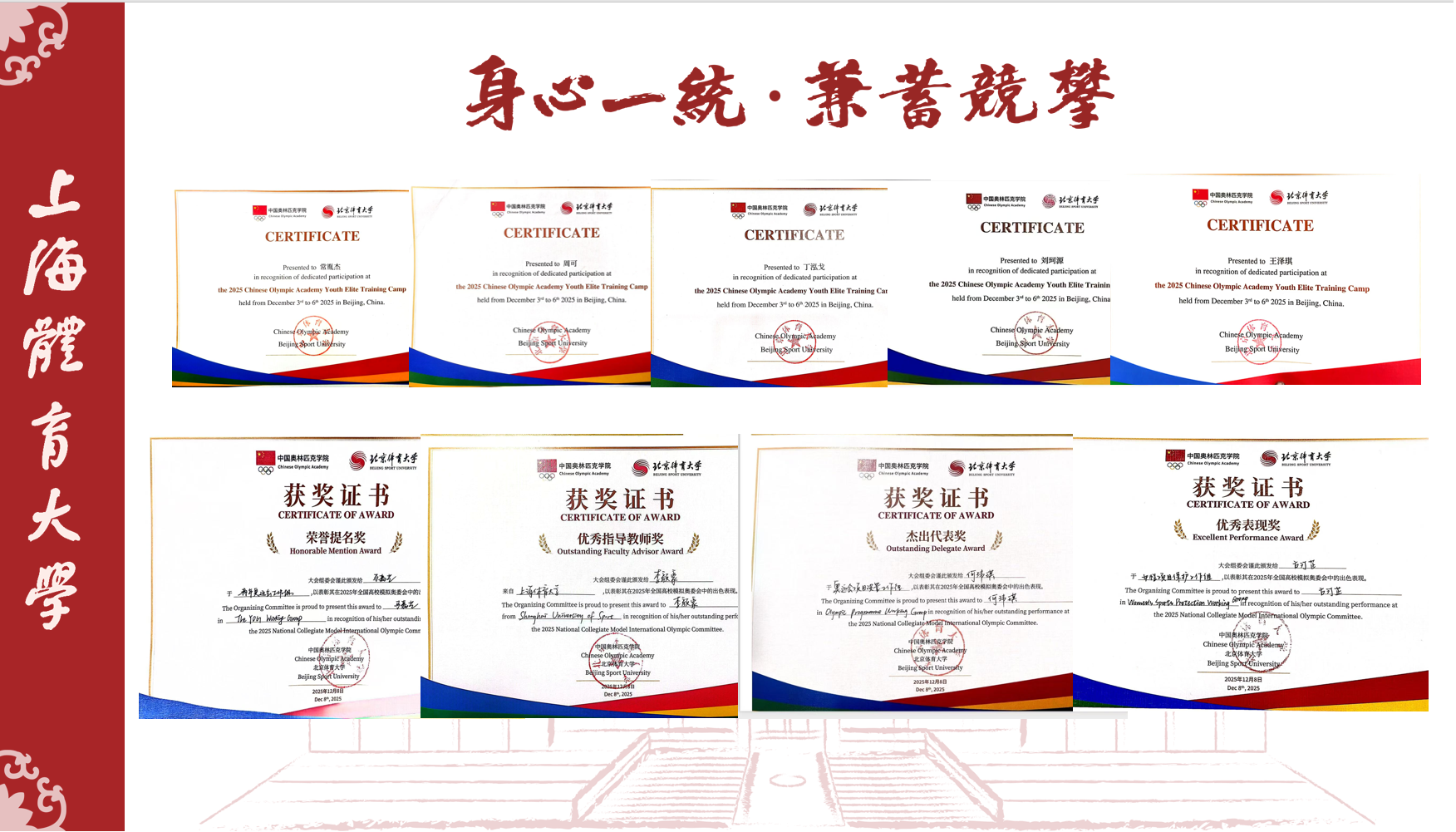 本网讯 2025年12月3日至8日,我校师生代表应邀前往北京体育大学,参加由中国奥林匹克学院主办的2025年奥林匹克青年骨干训练营和2025年全国高校模拟奥委会活动。期间,我校师生与其他高校师生展开深入交流,共同探讨新时代奥林匹克运动的发展方向。