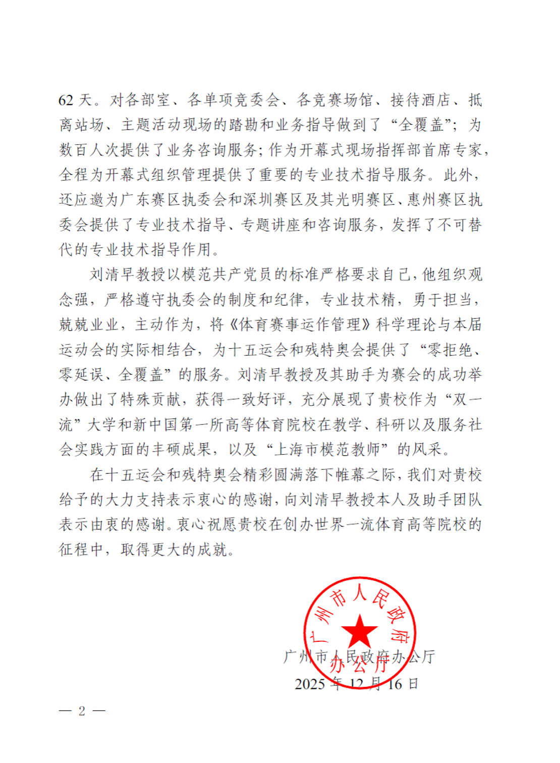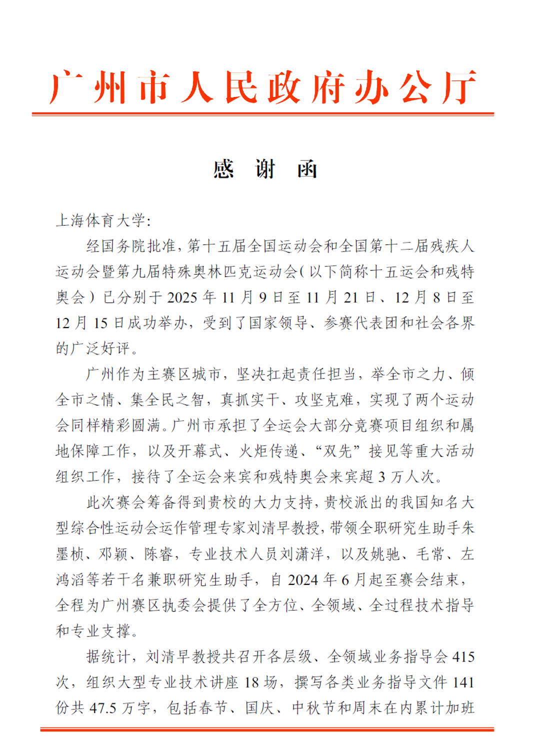 感谢函中提到:“在本次赛会的筹办工作中,我校派出我国知名大型综合性运动会运作管理专家刘清早教授担任“广州赛区执委会首席专家”和“十五运会和残特奥会现场指挥部首席专家”,带领全职研究生助手朱墨桢、邓颖、陈睿以及专业技术人员刘潇洋和姚驰、毛常、左鸿滔兼职研究生助手自2024年6月起,全程为广州赛区执委会和开幕式现场指挥部提供了全方位、全领域、全过程技术指导和专业支撑。一年多来,召开全领域业务指导会415次,组织大型专业技术讲座18场,撰写各类业务指导文件141份共47.5万字。为数百人提供了业务咨询服务。对所有涉赛区域、主题活动现场进行踏勘,全程为开幕式组织管理提供了重要的专业技术指导服务。还为广东省执委会、深圳、光明、惠州等赛区提供了专业技术指导。为十五运会和残特奥会提供了‘零拒绝、零延误、全覆盖’的服务,发挥了不可替代的专业指导作用。为赛会的成功举办做出了特殊贡献,获得了一致好评。充分展现了我校作为“双一流”大学和新中国第一所高等体育院校在教学、科研以及社会服务实践方面的丰硕成果。”