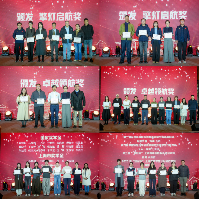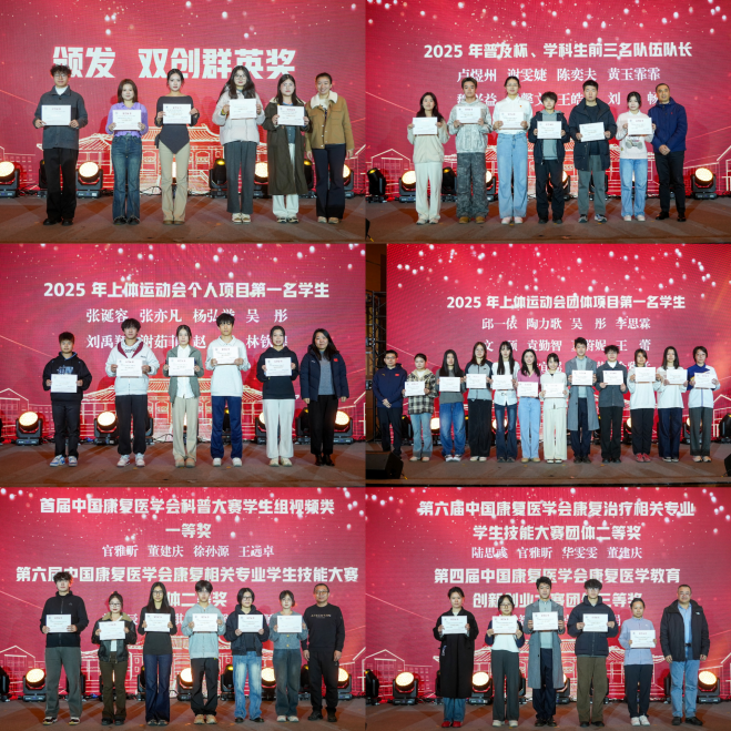 在庄重而热烈的音乐中,大会进入表彰环节。本次共设立“擎灯启航奖”“卓越领航奖”“学业卓越奖”“实践标杆奖”“双创群英奖”“体育风采奖”“学业菁英奖”七大奖项,覆盖教学、科研、学业、体育、双创、实践等多个领域,表彰个人与团队荣誉共计127人次。获奖师生依次上台,从颁奖嘉宾手中接过荣誉证书。每一份奖项背后,都是一段奋斗的故事,一次坚持的突破,更是学院“耀动健康”使命的生动实践。