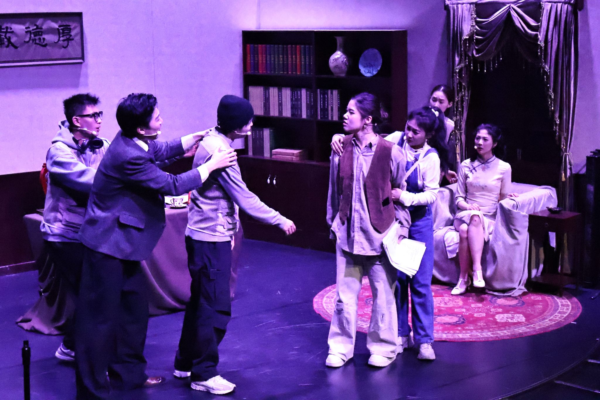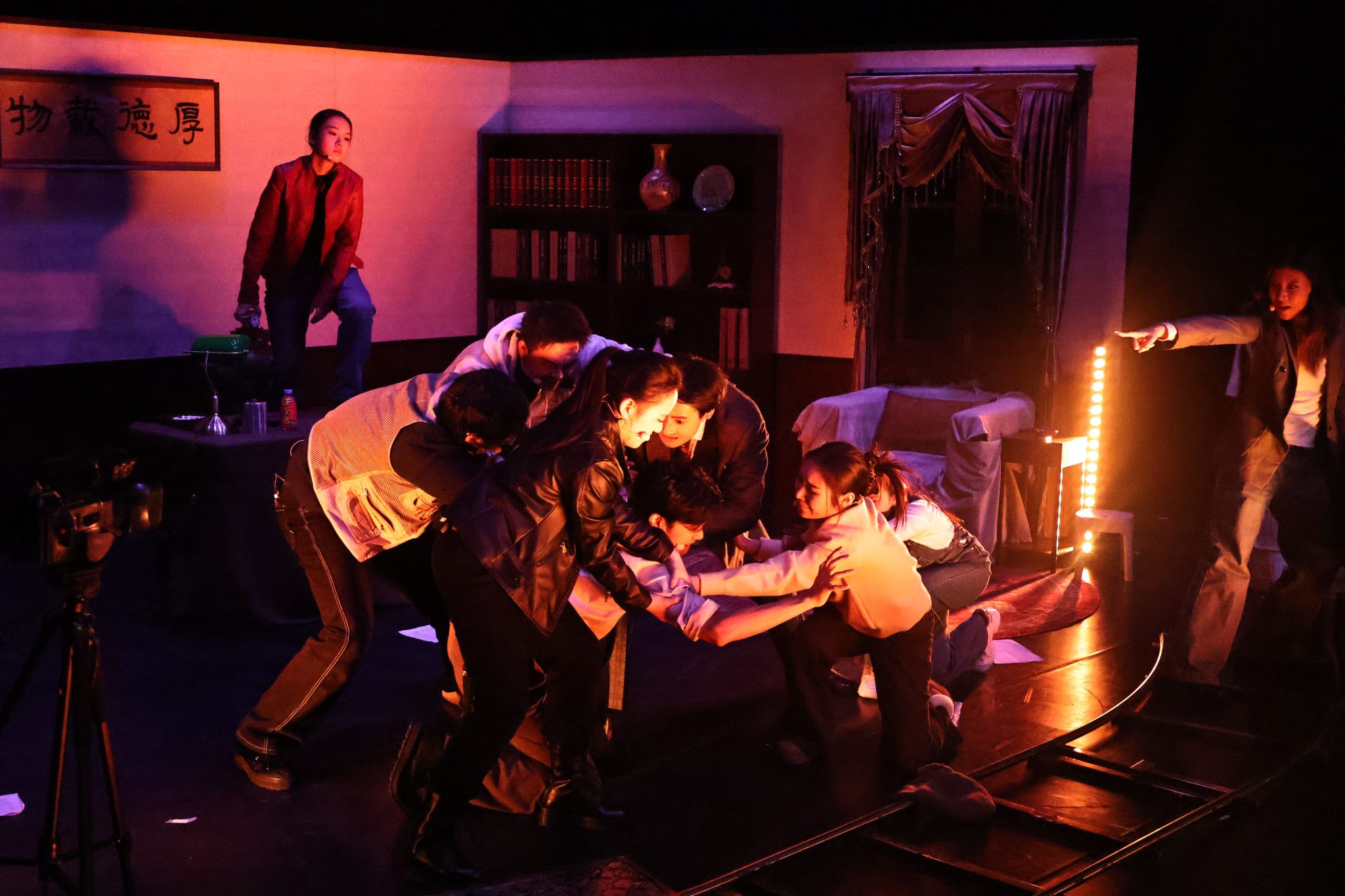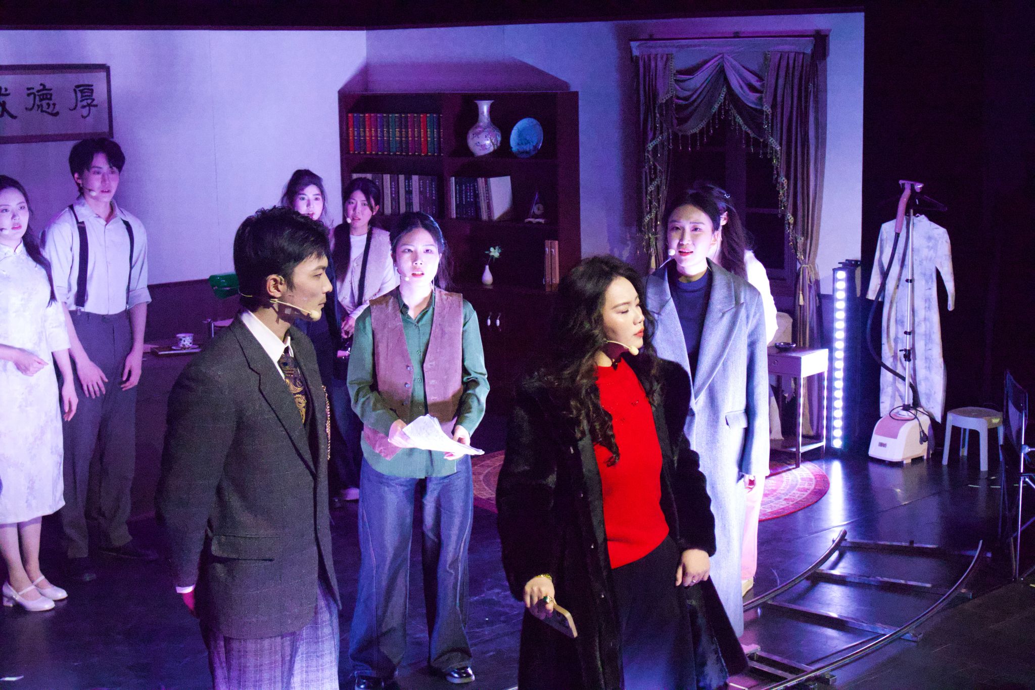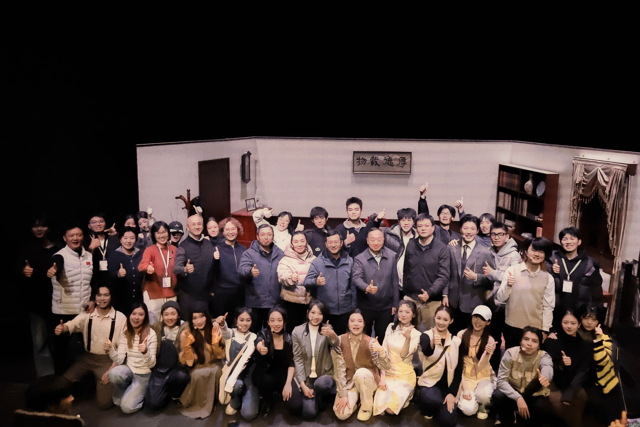 该剧从剧本策划到正式演出历时6个月,王晓璐老师带领53位学生克服困难,不分昼夜不论角色大小,坚持以学生为创作主体,通过讨论、即兴表演、多轮重排等方式激发学生潜能,多组演员阵容的设置让更多学子获得登台机会。演出中,演员们以饱满的情绪和稳定的完成度诠释角色,幕后团队也由学生担任,在灯光、舞美、调度、道具、剧务等方面紧密配合,共同保障了演出的顺利呈现,展现了上体学子的专业素养与团队协作精神。