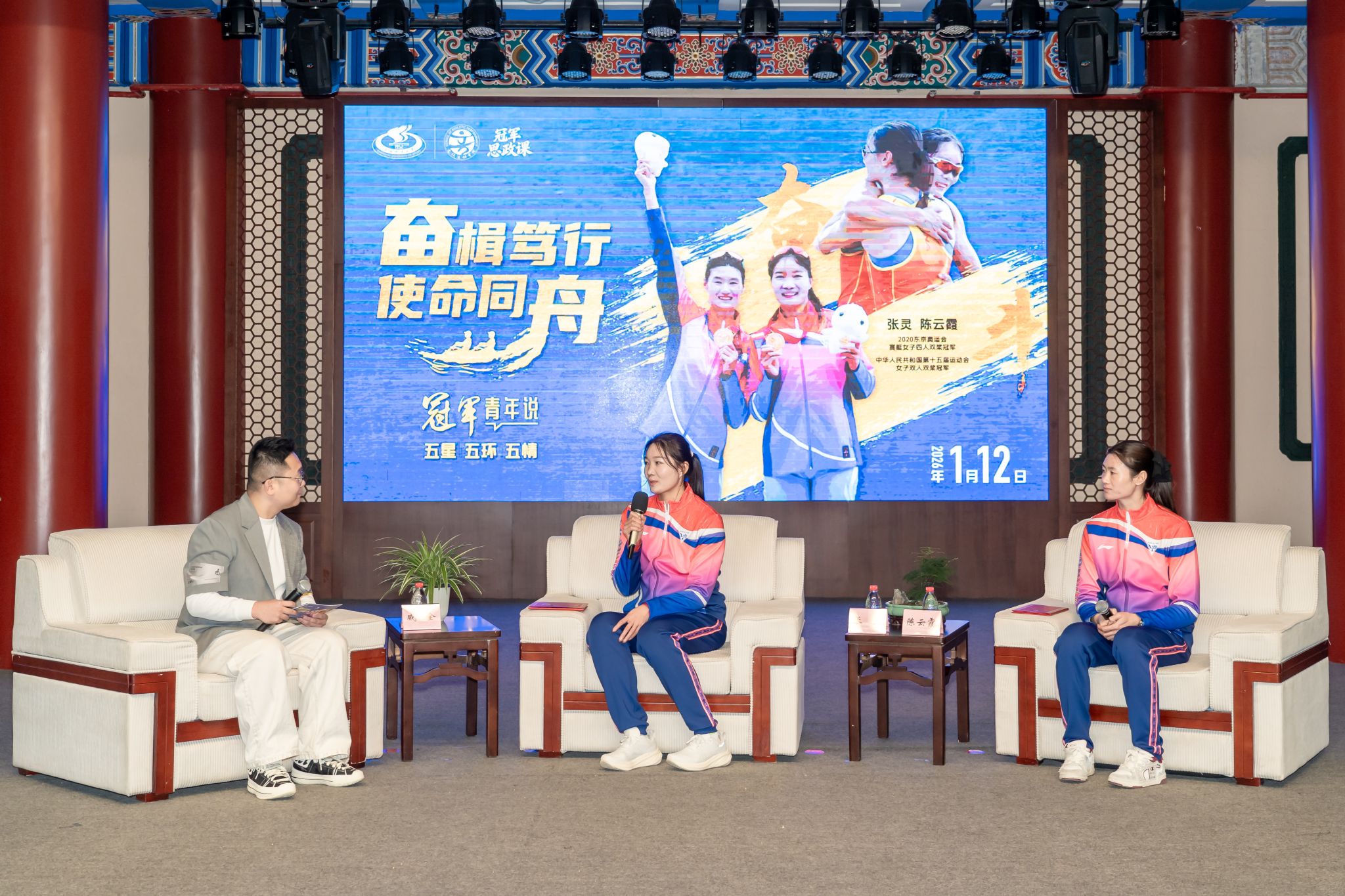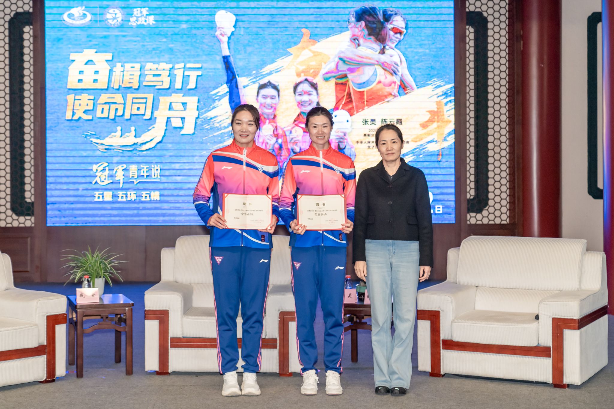 本网讯 1月12日,“奋楫笃行,使命同舟”冠军思政课暨“冠军·青年说”思政访谈活动在我校绿瓦大礼堂举行。东京奥运会、第十五届全运会女子赛艇冠军,我校“冠军班”2024级研究生陈云霞、张灵,围绕“奋斗”主题,深情讲述赛艇背后的拼搏历程。校党委副书记杨玲出席活动并为两位冠军颁发“绿瓦青年讲师团”聘书,校宣传部、学(研)工部、团委、竞技运动学院相关部门负责人,附属竞技体育学校40余名中学生运动员与近百名绿瓦学子共同参与。