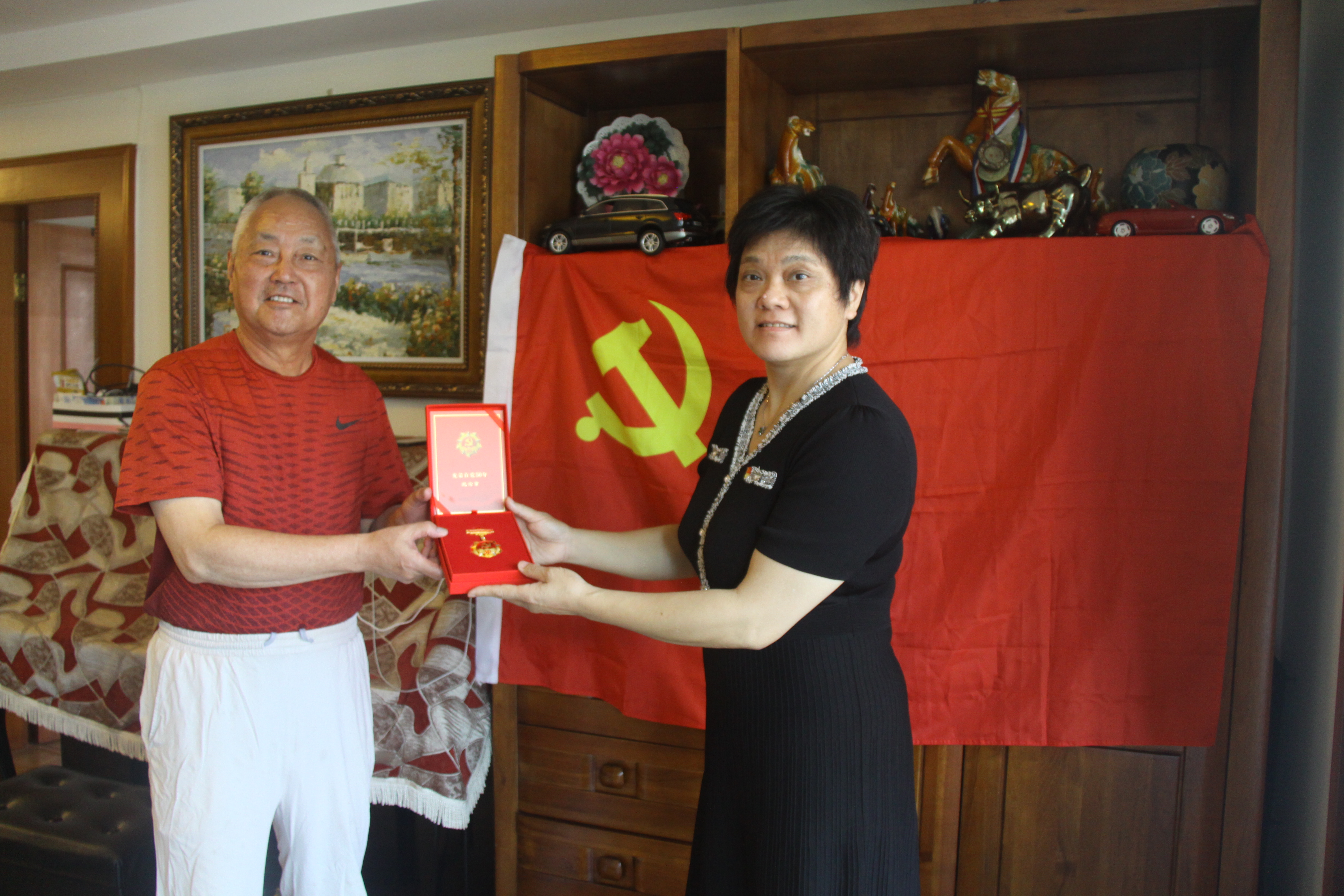 李芳书记分别为他们戴上这份沉甸甸的“光荣在党50年”纪念章并和他们合影留念。纪念章获得者结合自身经历,深情回顾谈到一个共同的话题——来自“工农兵”大学生的成长经历,感谢党对他们的培养和教育,感谢党组织的亲切关怀。今天能获得“光荣在党50年”纪念章,感到特别温暖、特别感动、特别光荣,表示要永远听党的话,跟党走。颁发仪式后退休党委书记李芳和党委委员孙华钱、赵惠菊上门走访慰问因病未能到场参加颁授仪式的郑继明同志,并为他送去纪念章。