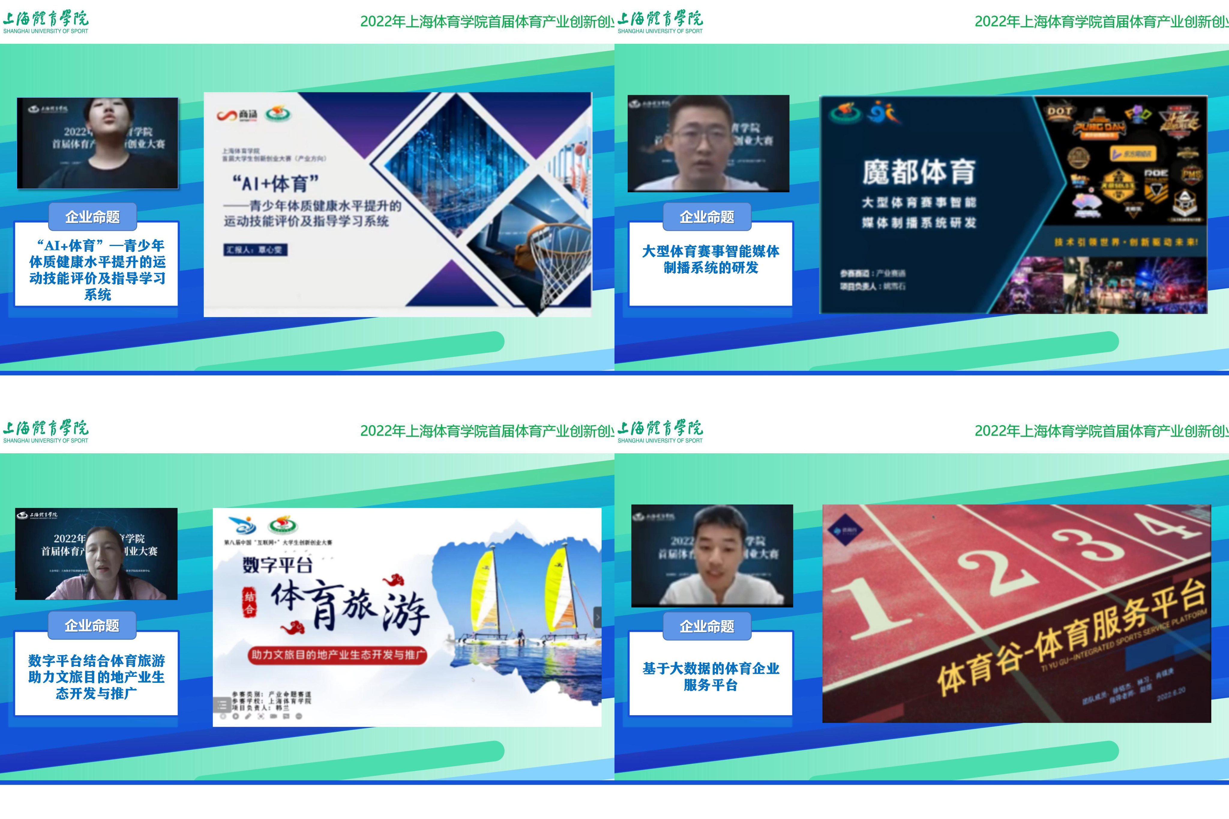 本网讯 为进一步激发我校大学生创新创业热情,推进上海体育学院产学研深度融合,打通高校智力资源和企业发展需求,加强校企共研项目培育,同时对标第八届中国国际“互联网+”大学生创新创业大赛产业命题赛道比赛,培养具有创新精神、创业意识和创新创业能力的体育产业人才。2022年6月20日,上海体育学院首届体育产业创新创业大赛(以下简称“校赛”)于线上圆满举行。创新创业学院执行院长吴雪萍、创新创业学院副院长陈伟、经管学院党委书记游林生全程观摩本次大赛。