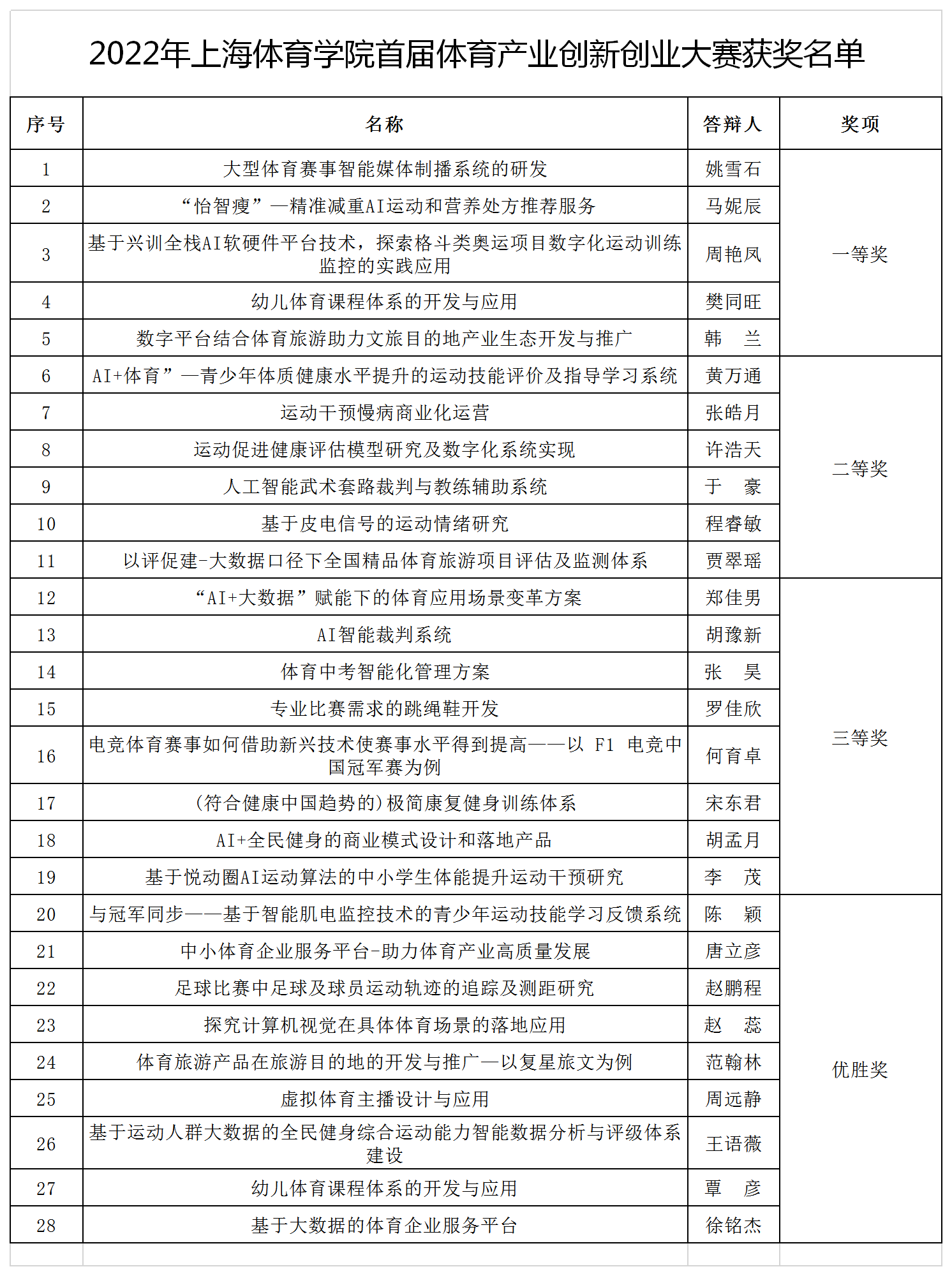 本次体育产业创新创业大赛共评选出一等奖5项、二等奖6项、三等奖8项、优胜奖9项,并推选20个项目参与第八届中国国际“互联网+”大学生创新创业大赛上海市赛产业赛道角逐,力争取得更新的突破。