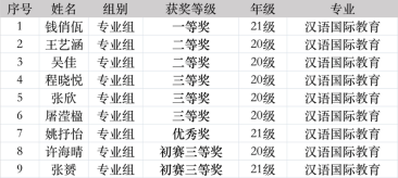 本网讯 近日,由中国语文报刊协会读写教学分会主办的“2022年第四届全国大学生语言文字能力大赛”圆满落幕。我校作为协办高校积极参加。新闻与传播学院汉语国际教育专业共有11名同学报名参赛。在史又今老师的悉心指导下,共有7位同学在专业组决赛中取得佳绩,其中2021级的钱俏佤同学更是摘得决赛专业组一等奖桂冠。我校学生获奖名单如下: