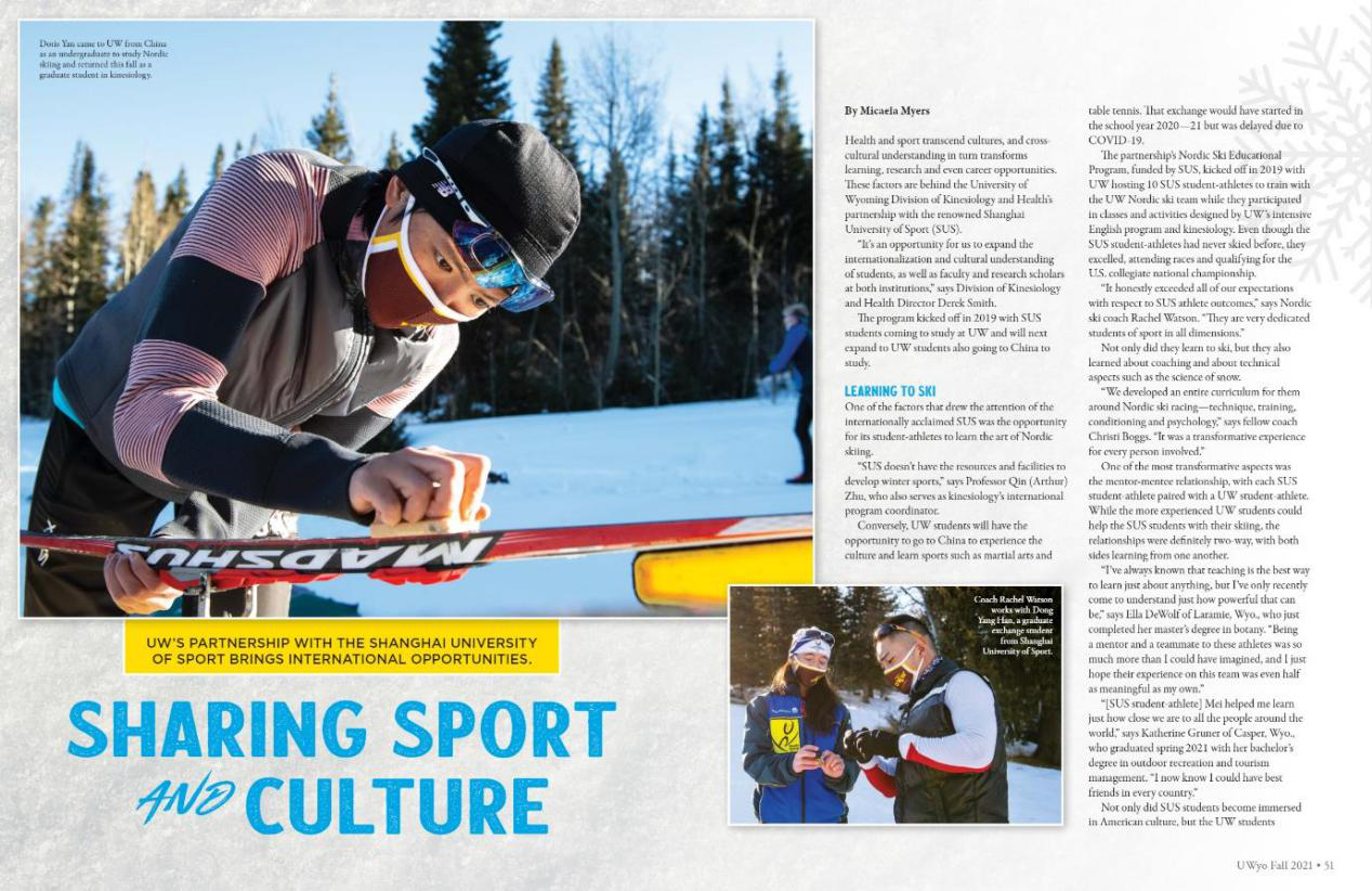 为响应国家“北冰南展”计划,2019年上海体育学院与美国怀俄明大学共同成立了上体-怀大海外中心,该中心作为上海体院在怀俄明大学的海外基地,旗下开展以海外教育、共同研究和体教结合项目为三大支柱的各类上体-怀大国际合作项目。“体教结合越野滑雪”项目是中心开展的特色冰雪项目,项目跨项选材身体素质与学习成绩兼优的学员,以零基础赴美学习越野滑雪运动的理论与实战,旨在积极践行北京冬奥精神的同时,为越野滑雪运动在我国南方的发展普及培养教练人才。项目实施以来,获得了包括中国驻美大使馆在内的广泛关注,并被中国国际电视台(CGTN)在内的众多主流媒体重点报道。2020年初,首届项目学员入选怀俄明大学代表队,并夺得全美大学越野滑雪锦标赛团体银牌,开中国南方体育类高校投身冬季项目高端复合型人才培养的先河。2021年12月,项目学员学成归来后代表我校参加第3届全国大学生越野滑雪锦标赛暨第31届世界大学生冬季运动会越野滑雪项目,取得个人项目前八名、团体前六名的突破,创造学校历史。