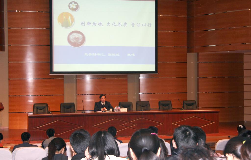 4月18日下午,我院党委副书记、副院长戴健在图文信息楼报告厅为第三十三期入党积极分子培训班学员作了《创新为魂   文化养质   责任以行》的专题报告。报告围绕创新人才培养、文化建设和社会服务三项学院重点工作展开,引用了国情、市情、校情各个层面的详尽实例,比较了中外大学文化建设的异同,为学生们献上了一堂生动的形势课和关于现代大学的讲座。他在报告中指出,创新无处不在,成功皆有可能,青年大学生一定要充分开采自身所蕴含的丰富矿藏,最充分地激发自身的创造活力;每一位上体学子要从自身做起,加强自身的文化自觉,积极投身文化建设实践,这样才能给予学院文化建设最大的生命力;要始终坚持责任以行、矢志求索,成为推动上体发展、服务社会和承担时代使命的重要力量,大力践行“团结竞攀、砺德践行”的上体精神。最后,戴健副书记祝福在座的入党积极分子始终充满年轻人锐意进取的朝气,在任何领域都做开拓创新的生力军;始终心怀对上体母校的拳拳深情,成为上体文化的共建共享者;努力培养堪为国器的志气和能力,不断激扬勇攀高峰、追求卓越的气质和信念,做报效祖国、服务人民的践行者。
