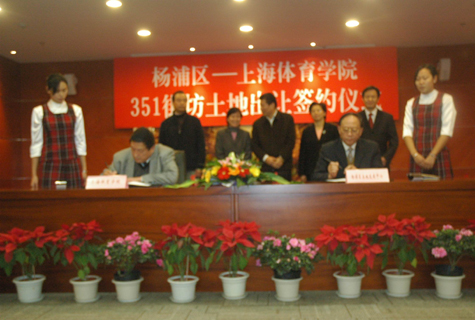 12月27日下午,杨浦区-上海体育学院351街坊土地出让签约仪式在我院图文信息楼举行。中共杨浦区委书记、区人大常委会主任陈安杰,区委副书记、区长宗明及我院党委书记虞丽娟、院长姚颂平和副院长王义林出席了签约仪式,我院相关职能部门负责人参加了仪式。会上,院长姚颂平代表我院与杨浦区进行了出让土地签约。院党委书记虞丽娟感谢杨浦区对我院内涵发展给予的实际支持,表示将用好资源服务杨浦,尤其是立足自身特色和已有的建设平台,培养优秀竞技体育人才,在三区联动中发挥应有作用。杨浦区区委副书记、区长宗明在讲话中对我院五十五年的办学成效给予了充分肯定,希望我院在全民体育健身和造福民生方面发挥辐射和引领作用,进一步促进杨浦的大发展和大繁荣。