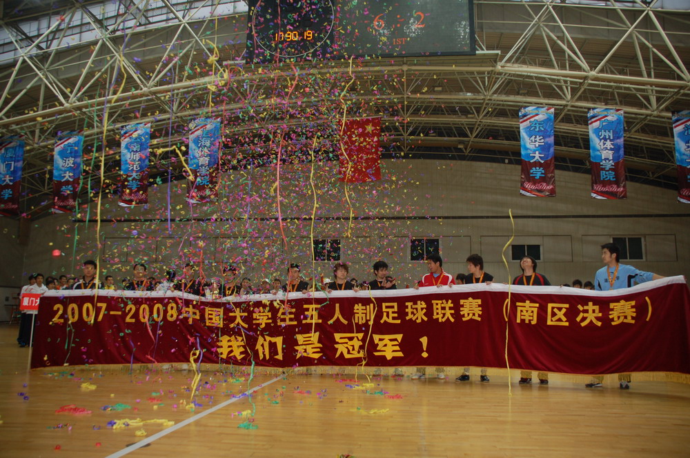 | 4月11日下午17:30分,在我院综合馆举行了2007-2008年中国大学生五人制足球联赛(南区决赛)闭幕式。闭幕式由我院院长助理陈晓峰主持。出席本次闭幕式的有中国大学生体育协会副主席、教育部学生体育协会联合秘书处秘书长杨立国、我院院长姚颂平、副院长章建成、组委会竞赛部副部长孙润兴、我院教务处处长吴瑛等多位领导。 首先,闭幕式由裁判长公布了比赛成绩:湖北大学、广州体育学院与云南师范大学分别夺得了此次比赛的冠亚季军,东华大学、上海体育学院以及湖南大学等剩余5支球队分获大赛的5-8名。接着,我院副院长章建成为最佳运动员、最佳射手等单项奖获奖运动员颁奖。随后,此次大赛监督联赛组委会竞赛部副部长孙润兴为获得体育道德风尚奖的两所学校和个人颁奖。中国大学生体育协会副主席、教育部学生体育协会联合秘书处秘书长杨立国为上海体育学院颁发了优秀赛事组织单位。