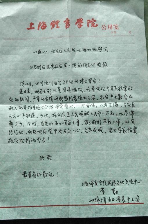 我院国际文化交流中心李勤老师得知地震这一不幸消息之后,从不多的工资中拿出一万元向灾区人民表达了自己的一片爱心。