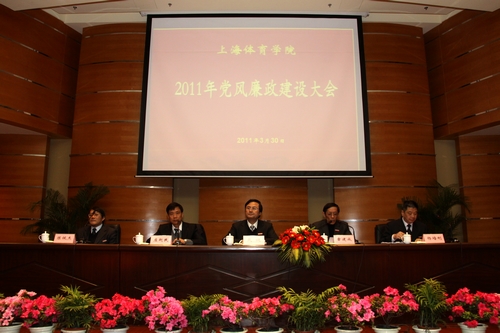 3月30日下午,2011年上海体育学院党风廉政建设大会在图文信息楼报告厅隆重召开。院党政领导及处级、科级党政干部;院党风廉政监督员、纪检员;党代表;各民主党派正副主委等出席了会议,大会由院长章建成主持。