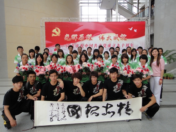 辉煌九十党旗艳,知识杨浦谱新篇。在中国共产党成立90周年之际,我校派出47名学生代表和棍极组合团队,作为大学生观众志愿者以及表演嘉宾,代表杨浦区大学生参加杨浦区庆祝中国共产党成立90周年大会活动。我院党委书记戴健和宣传部部长殷勤应邀出席了本次活动。