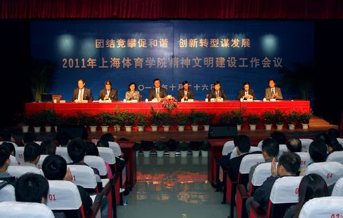 本网讯10月26日下午,2011年上海体育学院精神文明建设工作会议在大学生活动中心小剧场隆重召开。院党委书记、文明委主任戴健,上海市教卫党委文明办主任劳晓芸出席会议并讲话,院党委副书记、副院长、文明委副主任陈晓峰做了题为《聚焦基层促活力文化传承促创新 内涵建设促发展》的工作报告。会议由院长、文明委第一副主任章建成主持。