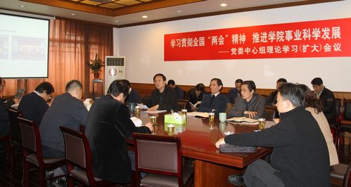 本网讯3月16日,我院党委中心组理论学习(扩大)会议在第一会议室举行,专题学习全国“两会”精神。党委书记戴健主持会议并做主题报告。院长章建成,党委副书记、副院长庄起民,党委副书记杨培刚,党委副书记、副院长陈晓峰,副院长陈佩杰、平杰、赵光圣出席会议并发言。