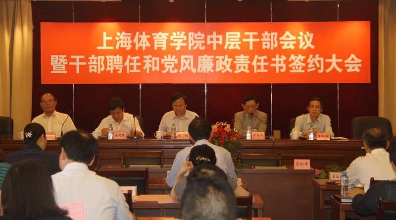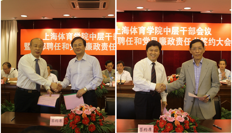 本网讯6月1日上午,我院处级干部聘任和党风廉政责任书签约大会在绿瓦大楼西报告厅举行,全体新聘任中层干部参加了会议,党委书记戴健,院长章建成,纪委书记、党委副书记庄起民,副院长平杰,党委副书记、副院长陈晓峰出席本次会议,会议由章建成院长主持。会上,院领导与新聘任干部代表进行了干部聘约和干部廉洁从政承诺书签约仪式,处级干部代表刘宏宣读了廉洁从政承诺书,体育休闲与艺术学院党总支书记李芳以及人事处处长游林生作了交流发言。