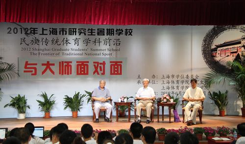 本网讯6月28日下午,民族传统体育学科前沿—2012年上海市研究生暑期学校“与大师面对面”活动在学院活动中心一楼报告厅举行,主题是“武术的昨天、今天和明天”。我国著名的技击家、中国武术九段、享有“神拳大龙”美誉的蔡龙云大师,中国武术九段王培锟教授,中国武术九段、博士生导师邱丕相教授应邀出席活动。