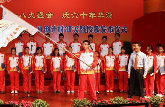 仪式上,戴健、章建成与教师代表、学生代表一起,共同为校庆30天倒计时牌揭幕,章建成为校庆志愿者代表授旗。