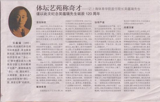 本网讯在我校迎接建校六十周年华诞之际,11月7日出版的《东方教育时报》(No.128,总第1698期)以专版形式刊登了标题为《体坛艺苑称奇才——记上海体育学院首任院长吴蕴瑞先生》的文章,谨以此文纪念吴蕴瑞先生诞辰120周年。