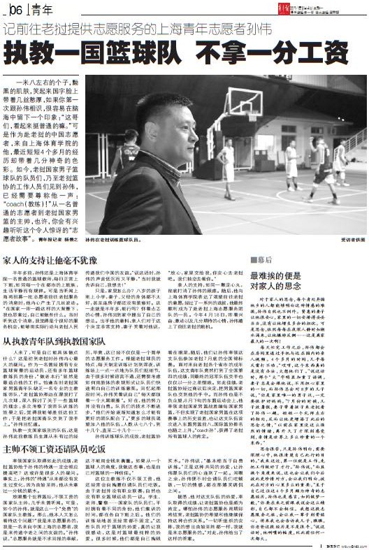 9月4日,《青年报》用整版的篇幅报道了孙伟在老挝的志愿服务事迹,孙伟在采访中表示,“志愿服务就是不求回报的奉献,这不能用金钱来衡量。如果从一个篮球人的角度,我做这些事,也是自己对篮球的一种信仰。”。