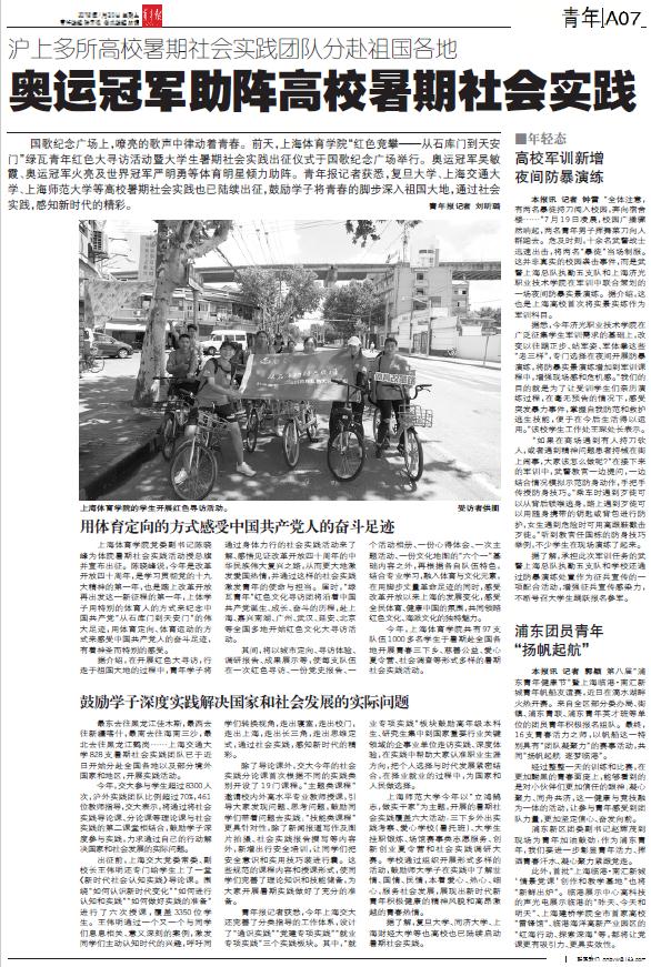 今年,上海体育学院共有97支队伍1000多名学生于暑期赴全国各地开展青春三下乡、慈善公益、爱心夏令营、社会调查等形式多样的暑期社会实践活动。
