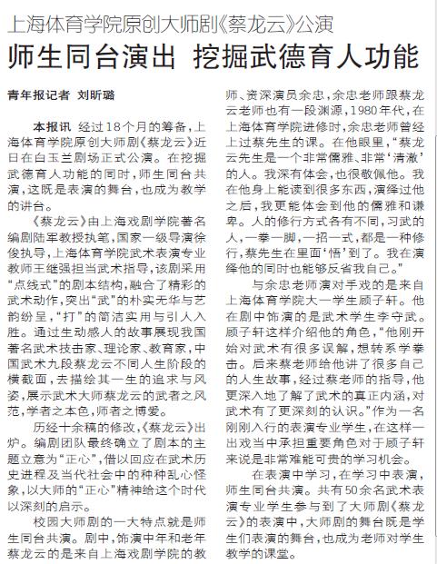 本报讯经过18个月的筹备,上海体育学院原创大师剧《蔡龙云》近日在白玉兰剧场正式公演。在挖掘武德育人功能的同时,师生同台共演,这既是表演的舞台,也成为教学的讲台。