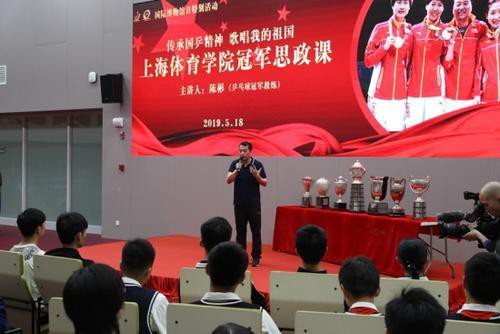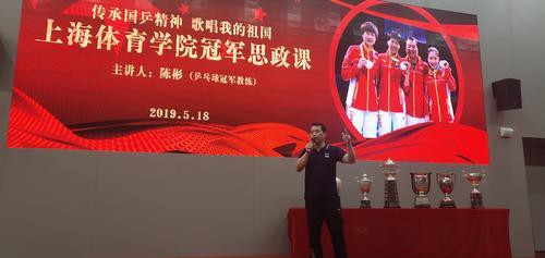 学生们在观看藏品和聆听讲解之后来到乒博馆“冠军堂”,等待他们的是中国乒乓球队的冠军教练、中国乒乓球学院教师陈彬。陈彬曾是奥运冠军、大满贯得主丁宁的主管教练。近四十年的执教生涯,使他对“国乒精神”的传承与发扬形成了独到的感受。在与上海体院马克思主义学院教师马焕对体育精神的理论解读后,陈彬教练结合自己在国家队的训练和大赛经历,向学生们解读中国乒乓球长盛不衰的“奥秘”,讲述奥运冠军背后那些不为人知的奋斗故事。中国乒乓球队的集体主义精神和国家利益高于一切的荣誉感感染着在场的每一位学生。课上,丁宁也发来了视频,在她看来,每一个世界冠军都不是一个人在战斗,她们的背后站着一个强大的国家和一大批默默奉献、无私付出的人们。她鼓励同学们“在追梦的道路上敢于挑战,不惧困难,为国家奉献自己的青春力量。”