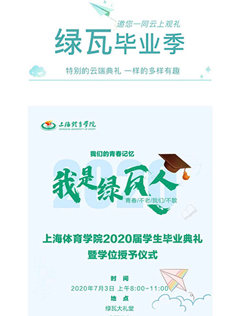 人民网北京7月3日电 7月3日,上海体育学院2020届学生毕业典礼暨学位授予仪式在学校绿瓦大礼堂举行。为了让全体师生共享这场在修缮一新的绿瓦大楼内举行的首场毕业典礼,学校精心打造“我是绿瓦人”的“云端”毕业典礼。全校教职员工、毕业生及亲属、校友和社会各界人士通过云毕业典礼、学习强国等直播平台分享了一场特殊的典礼仪式。
